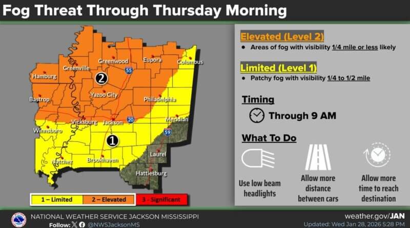 Officials advise drivers to reduce speed and use low beam headlights when traveling in foggy conditions to increase visibility and safety.