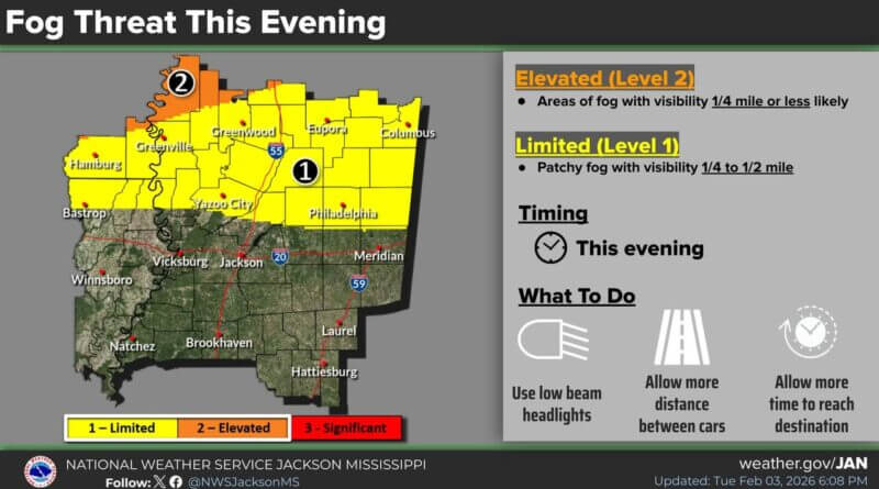 A period of dense fog may develop this evening across portions of North Mississippi and Southeast Arkansas, according to weather forecasts.