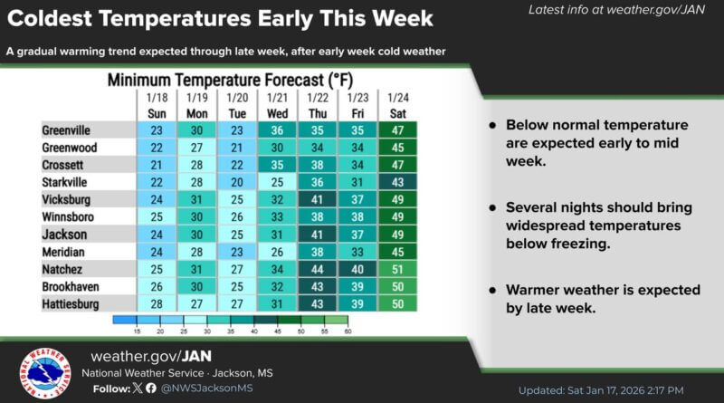 The coldest temperatures of the week are expected early, with several nights bringing widespread freezing conditions, according to weather forecasts.