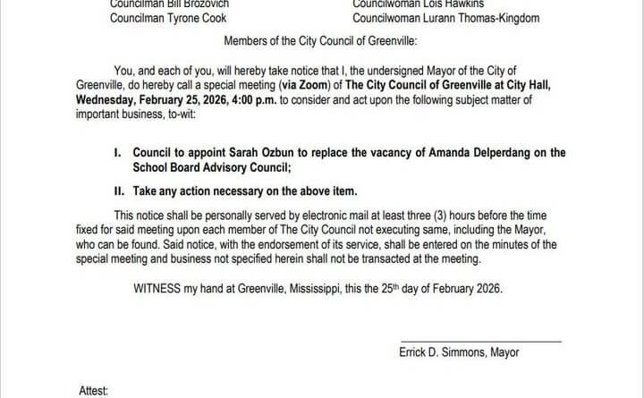 The Greenville City Council announced a special meeting set for February 25, 2026, at 4 p.m. Central Time. The session will be held virtually via Zoom, according to a notice from the city.