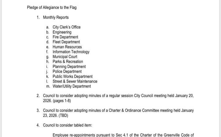 The City of Greenville, Mississippi, announced its upcoming city council meeting scheduled for February 3, 2026. The agenda for the meeting has been posted on the city’s official channels.