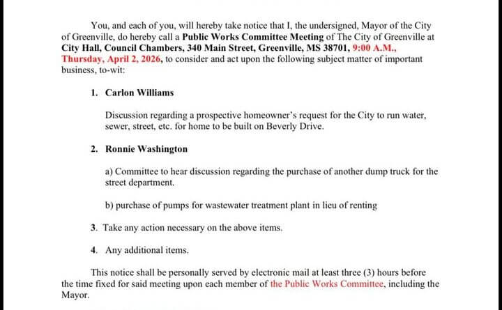 The City of Greenville announced a Public Works Committee meeting scheduled for April 2, 2026. The meeting will be held at the city hall and is open to the public, according to a notice from city officials.