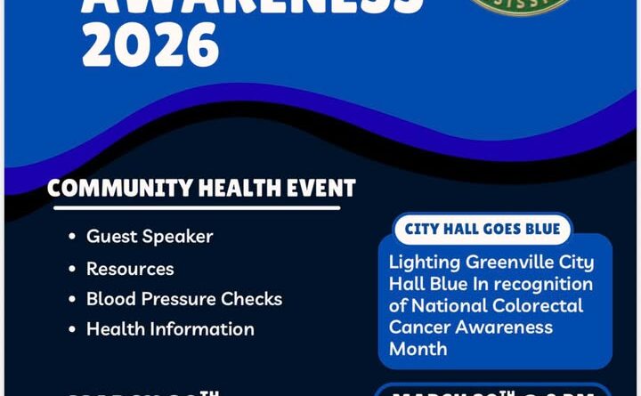 Greenville Mayor Errick D. Simmons has invited residents to attend a Colorectal Cancer Awareness Community Health Event on March 20 at City Hall. The event runs from 10 a.m. to 1 p.m. and will include a guest speaker, health screenings, and information on early detection and prevention.
