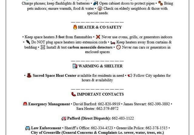 Greenville, Miss. — City officials in Greenville are urging residents to prepare for winter weather, which is expected to impact the area. Mayor Errick D. Simmons encouraged residents to follow safety tips for home preparation, heater use, and carbon monoxide safety.