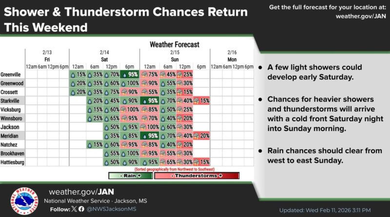 Chances for heavier showers and thunderstorms are expected to arrive with a cold front Saturday night into Sunday morning.