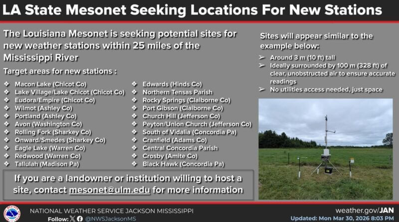 The Louisiana State Mesonet is seeking potential sites for new high-quality weather stations along the Lower Mississippi River as part of an effort to enhance weather monitoring and forecasting. The initiative aims to expand coverage into parts of Arkansas and Mississippi.