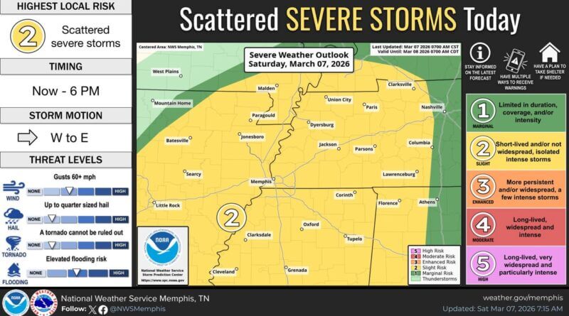 The National Weather Service has expanded the slight risk of severe weather to include the entire Mid-South region. The risk level is classified as 2 out of 5.