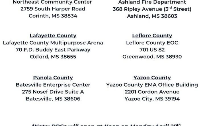 The Mississippi Emergency Management Agency (MEMA), in coordination with federal and local partners, will open six Disaster Recovery Centers and seven Disaster Survivor Assistance sites beginning at noon Monday, April 27.