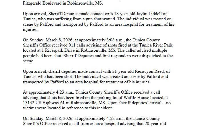 Authorities in Tunica County responded to multiple shooting incidents between March 7 and March 9, 2026, resulting in injuries and multiple arrests, according to sheriff’s office reports.