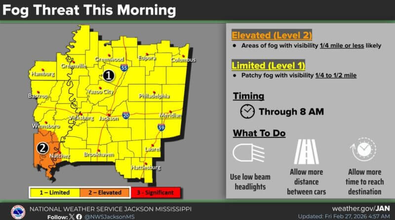 The National Weather Service in Jackson, Mississippi, issued a warning Tuesday morning about areas of fog in the region. Some of the fog is expected to be locally dense, prompting officials to urge caution during the morning commute.