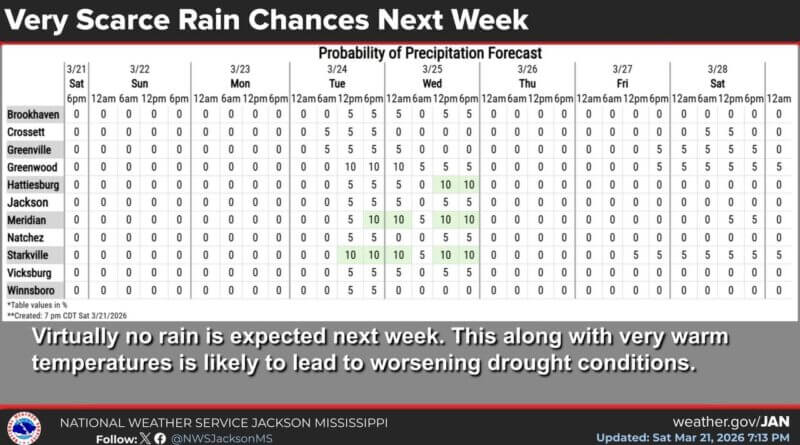 Dry weather is forecasted to persist throughout the week, according to meteorologists. The next reasonable chance for rainfall does not appear until early April.