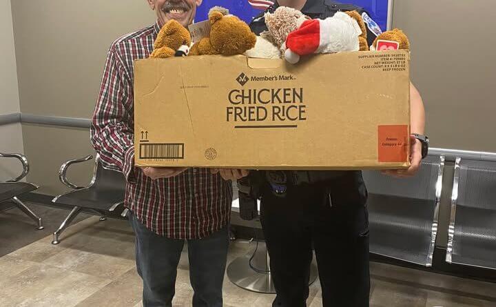 Police officials announced that Mr. John Sharpe delivered a box of new teddy bears to the department on Thursday. The toys are intended for officers to keep in patrol cars and use during emergencies.