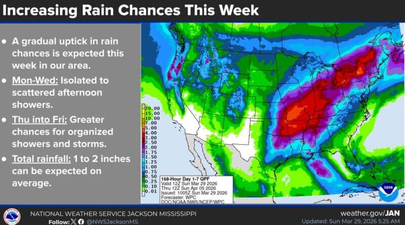 Weekly rainfall totals are projected to range from 1 to 2 inches on average, officials added.