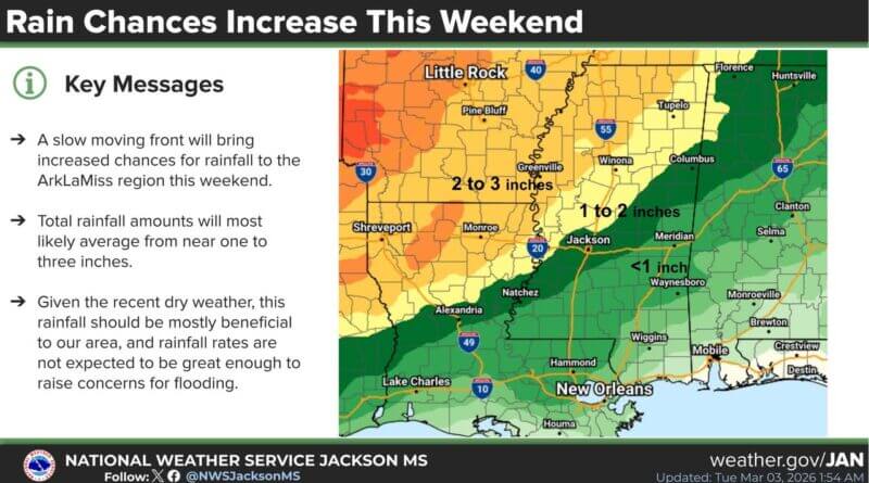 Rain chances are expected to increase across the ArkLaMiss region this weekend, according to weather forecasts.