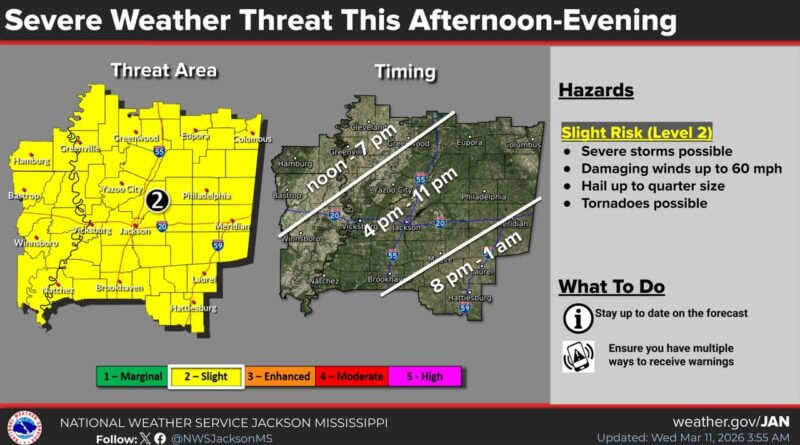 Severe storms expected in Mississippi with damaging winds, hail, and tornado threat