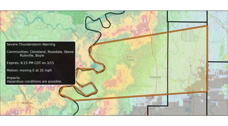 Affected communities include Cleveland, Rosedale, Skene, Ruleville, Boyle, Drew, Benoit, Merigold, Mound Bayou, and Renova, the agency said. Hazardous conditions are possible as the storm progresses.