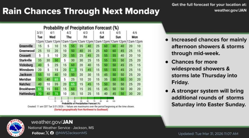 Storm chances increase through mid-week, with stronger systems forecast for Easter weekend