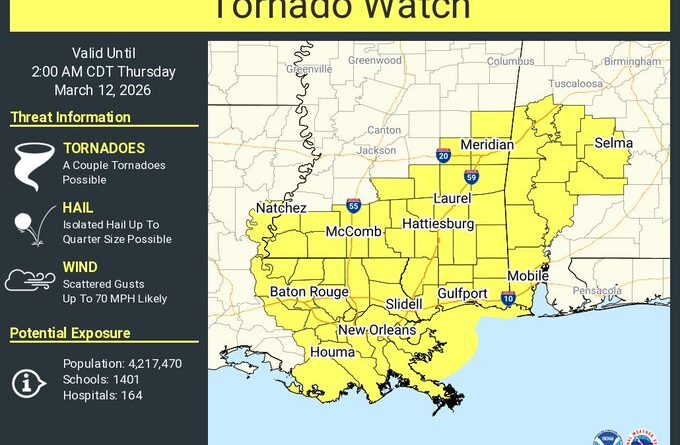 Tornado Watch Issued for Parts of Alabama, Louisiana, Mississippi Until 2 a.m. CDT