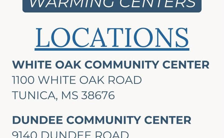 The White Oak Community Center, located at 1100 White Oak Road in Tunica, and the Dundee Community Center at 9140 Dundee Road in Dundee, will serve as warming centers. Officials advise residents to call 662-357-0523 for hours of operation and transportation assistance.